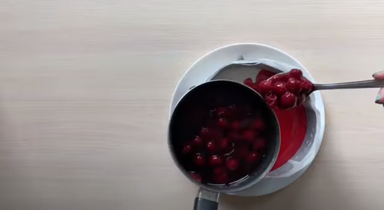 - В сироп, где варилась вишня, всыпаем желатин, перемешиваем до полного растворения кристаллов, заливаем им торт.