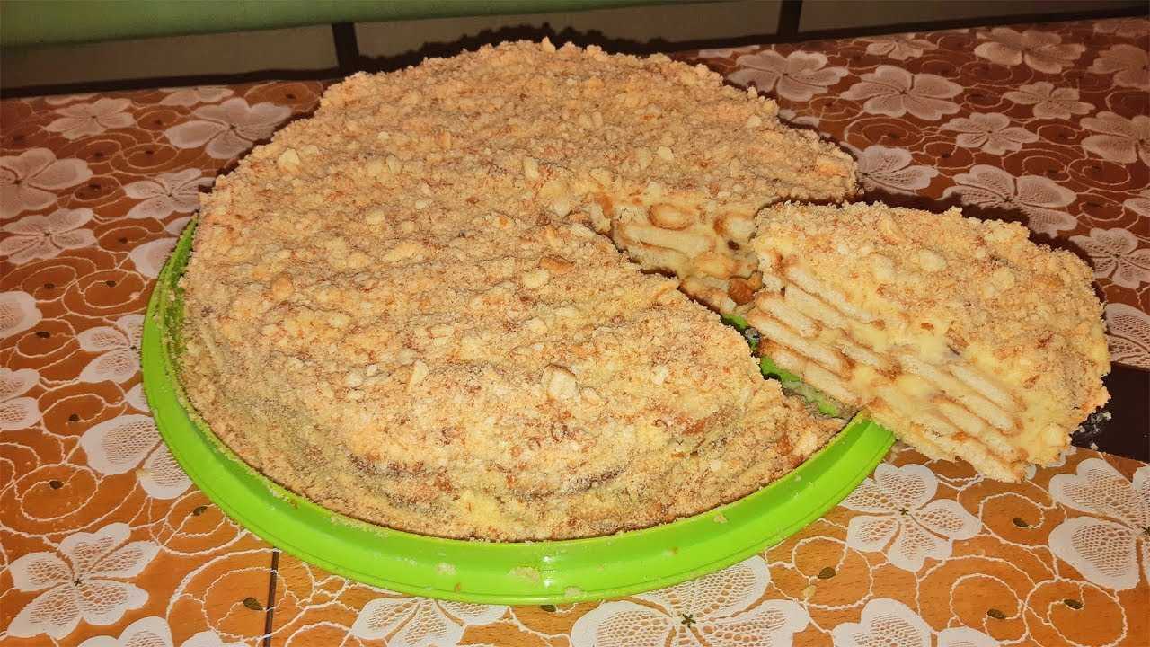 Наполеон посыпаю сверху измельченной крошкой и ставлю в холодильник на целую ночь. Для него не хватит двух или трех часов, если вы хотите, чтобы он был мягким.