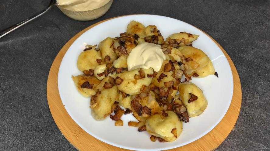 Вареники с картофелем берем любые — приготовленные дома по любимому рецепту, либо купленные в магазине. Это не слишком отразится на вкусе готового блюда, а лишь отрегулирует время приготовления.