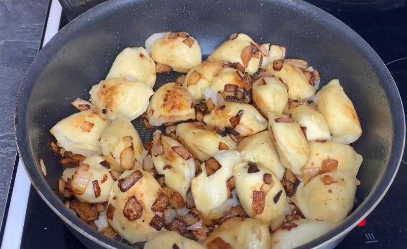 Вареники отварить до готовности. Переложить их в сковороду с поджаркой, быстро обжарить до появления корочки, иногда перемешивая.