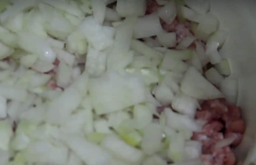 2. Оставьте отдыхать тесто, а в это время подготовьте начинку. В свиной фарш для сочности добавьте нарезанный мелким кубиком лук. Его количество можете регулировать по своему вкусу. Не любите лук — добавьте меньше. Хотите сочную начинку — добавьте больше.