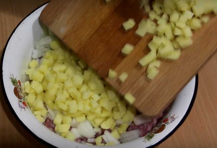3. Картофель тоже нарезайте мелким кубиком. Это нужно для того, что бы начинка хорошо пропеклась. Добавьте картошку к мясу с луком. Все ингредиенты посолите, поперчите по вкусу и тщательно перемешайте руками.