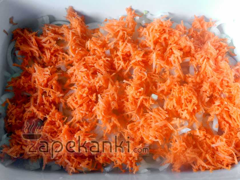 3. Металлическую или керамическую форму для запекания смазываем растительным маслом. Если используете силиконовую форму, то ее смазывать не нужно. Лук репчатый очищаем от шелухи, промываем под проточной водой и нарезаем полукольцами. Подготовленный лук выкладываем тонким слоем на дно формы. Морковь очищаем, промываем и натираем на крупной терке, можно использовать замороженную на зиму морковь. Подготовленную морковь выкладываем в форму поверх лука. Чуть-чуть солим и перчим овощи для запеканки.