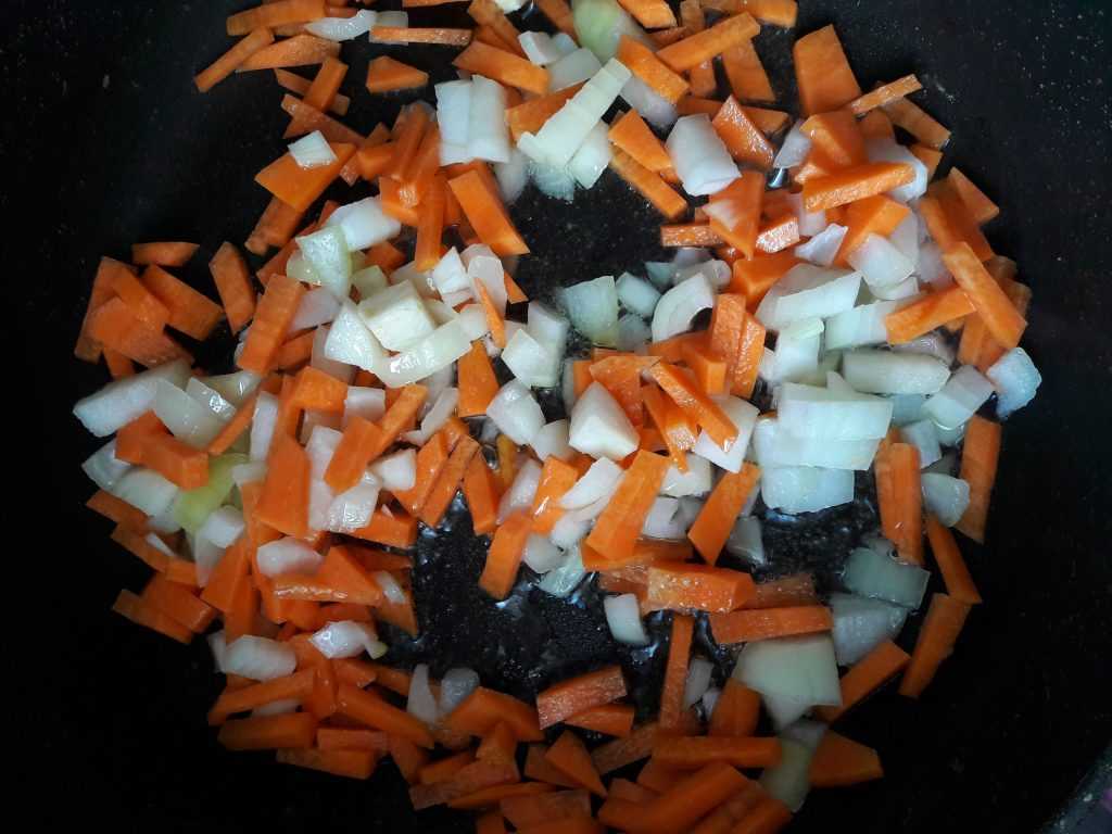 Лук следует нарезать мелкими кубиками. А вот морковь очистить, натереть на крупной тёрке. Всё это сложить на горячую сковороду с растительным маслом. Обжарить, в течение 5 – 7 минут. Постоянно помешивая. Овощи должны стать мягкими, золотистыми. При этом, огонь следует сделать средним