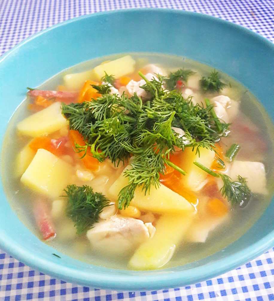 Курица в виде, например, копченых ножек сделает вкус супа более насыщенным. Не стоит забывать и о свежей зелени, она не служит не только украшением готового блюда, но и содержит полезные витамины. Ингредиенты: