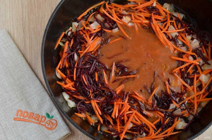 Сначала сделаем основу для борща – яркую жидкость, в которой будут «плавать» остальные ингредиенты.