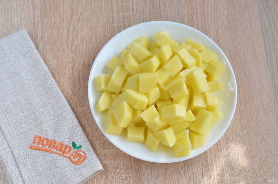 - Чистим картофелины, режем их кубиками и отправляем в емкость с холодной водой — так выйдет лишний крахмал;