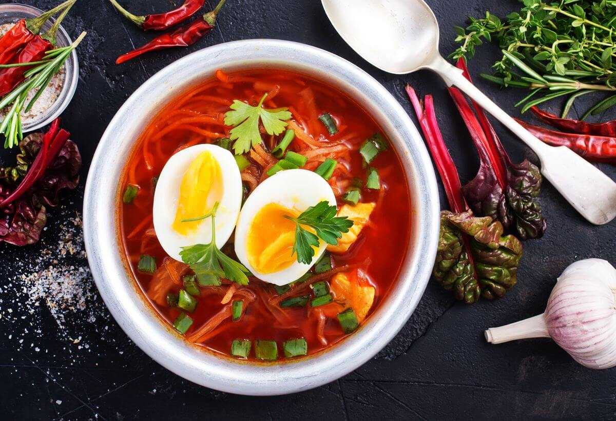 Рецепт можно дополнить корешком сельдерея, но это уже по желанию. Готовый борщ солят, посыпают любимыми специями и дают хорошо настояться. Холодное блюдо разливают по тарелкам. Кладут по половинке вареного яйца и ложку сметаны. Можно кушать!