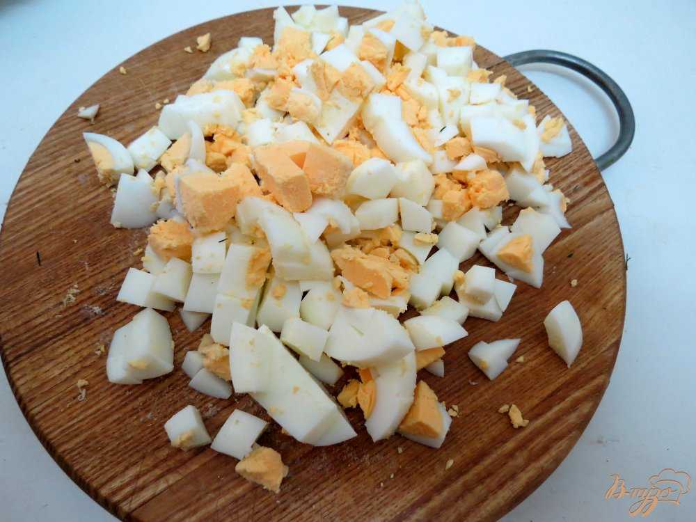 Яйца удобнее всего нарезать используя яйцерезку. Или порезать на кухонной доске острым ножом кубиками. Отварены они должны быть вкрутую. У меня магазинные, но домашние, с ярким желтком гораздо вкуснее. К сожалению, сейчас нет возможности такие купить.