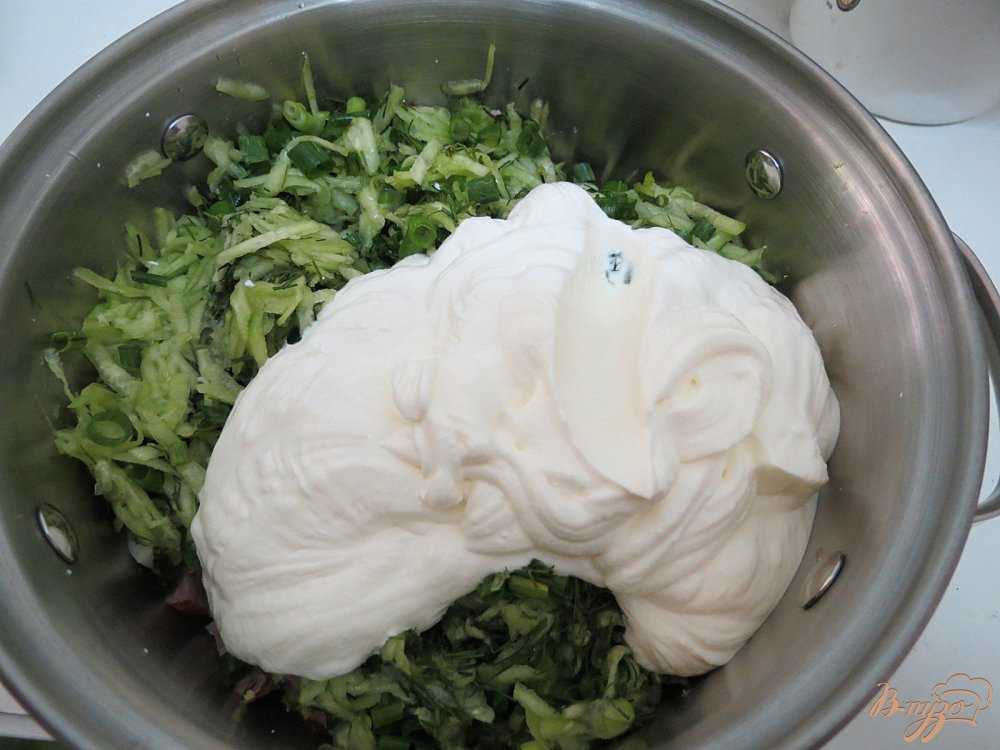 Все продукты смешать в подходящей по объёму кастрюле. Посолить по вкусу, затем залить массу сывороткой и сметаной. Все ещё раз помешать.