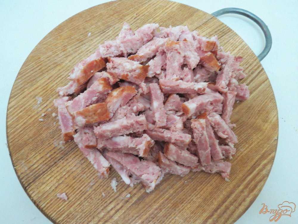 - Колбаса также нарезается на кубики, но уже более крупного размера — примерно 1см.х1см.