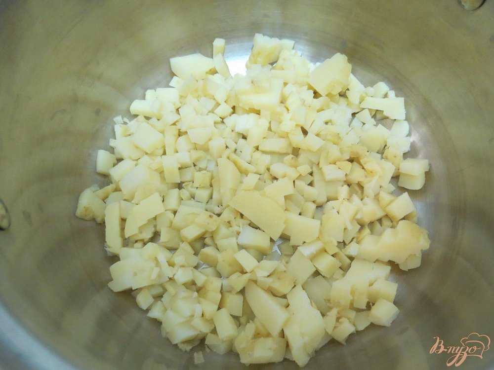 Картофель отвариваем, вынимаем его из отвара, а отвар не выливаем, охлаждаем. Картофель мелко нарезаем.