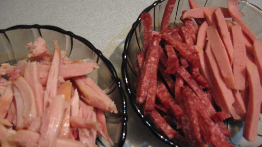 Нарезаем соломкой куриное мясо с окорока, колбасу и сосиски и перекладываем в кастрюлю.