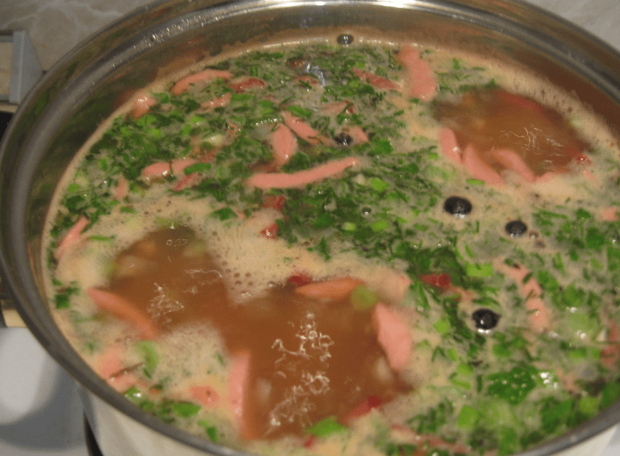 Примечательный этот рецепт приготовления солянки с сосисками тем, что в нем большое количество мяса. В нем свинина, курица, сосиски и конечно же колбаса… Словом, блюдо получится очень сытным!