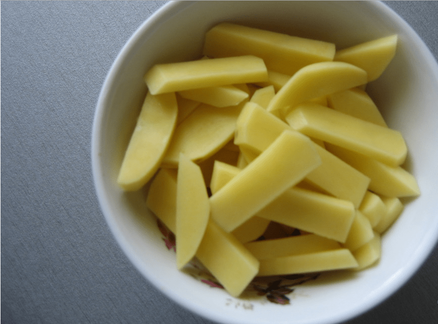 Отвариваем бульон из мяса на кости. Моем, чистим, нарезаем соломкой картофель и бросаем в бульон.