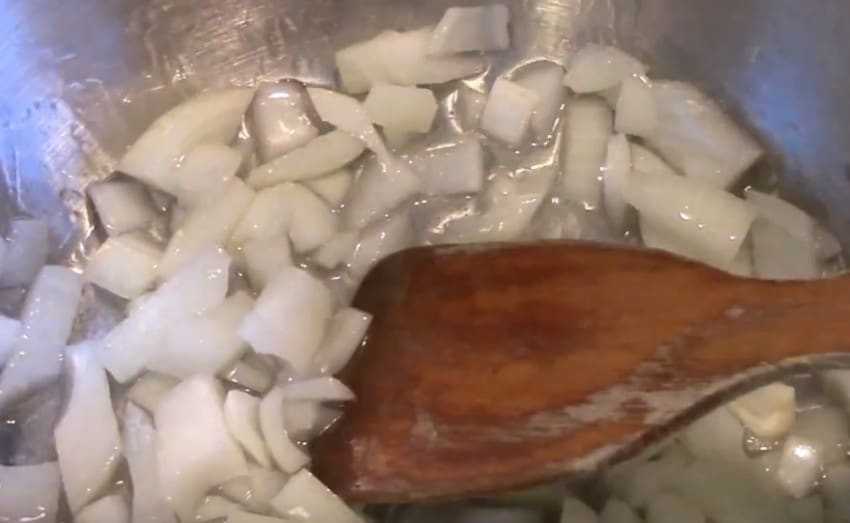 - Обжарьте в нагретой емкости луковые и морковные кусочки до золотистого оттенка.