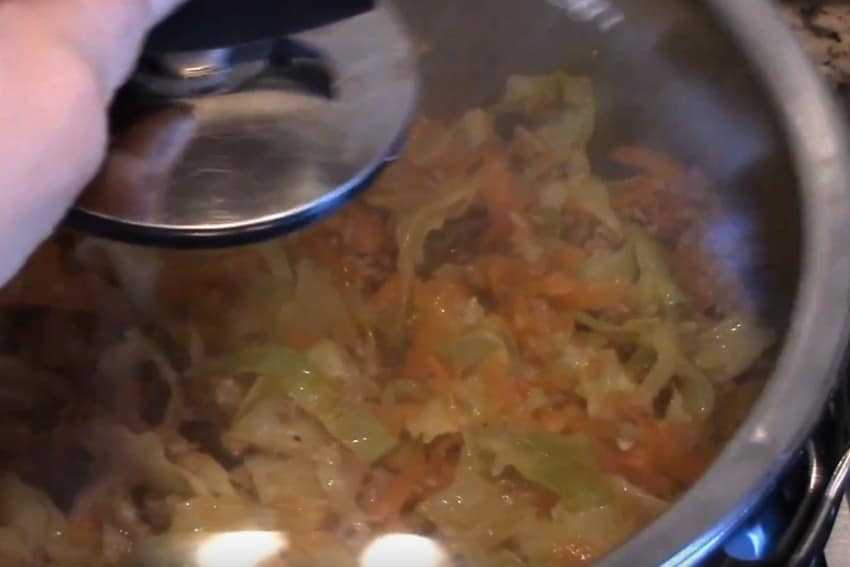 В сковороде прогреть растительное масло, переложить в сковороду морковь, лук и нарезанную капусту. Теперь перемешать овощи и припустить на небольшом огне. Также можно подлить немного воды или бульона в сковороду, тушить капусту 10-15 минут.