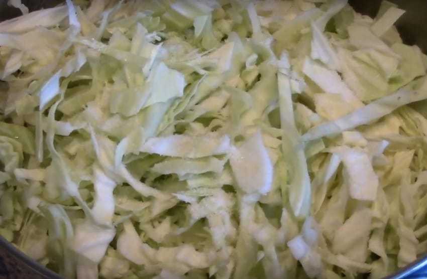 - Нарезать тонкой соломкой свежую капусту. Высыпать ее на сковороду, добавить тмин, черный перец. Обжаривать при средней мощности нагрева в течение примерно 15-20 минут. Свежая капуста добавляется по желанию, блюдо можно готовить только из квашеной.