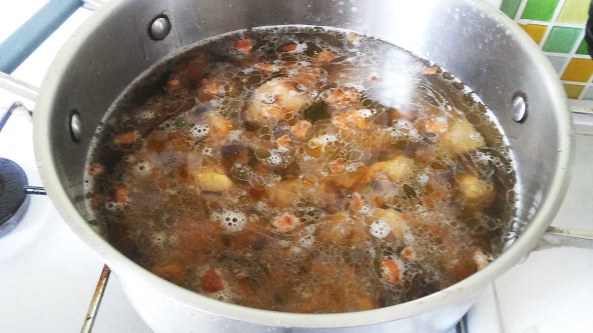 - Затем добавляем кипяток или бульон, чтобы заполнить сковороду почти до верха. Добавляем специи по вкусу: чеснок, перец, лавровый лист и другие любимые приправы.