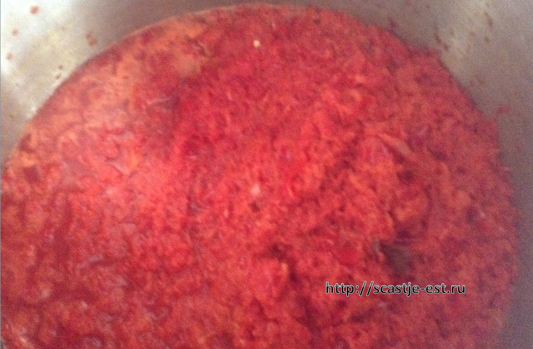 - Все овощи помыть. Пропустить их через мясорубку и переложить в кастрюлю, поставить на огонь. Довести до кипения и томить 40 минут.