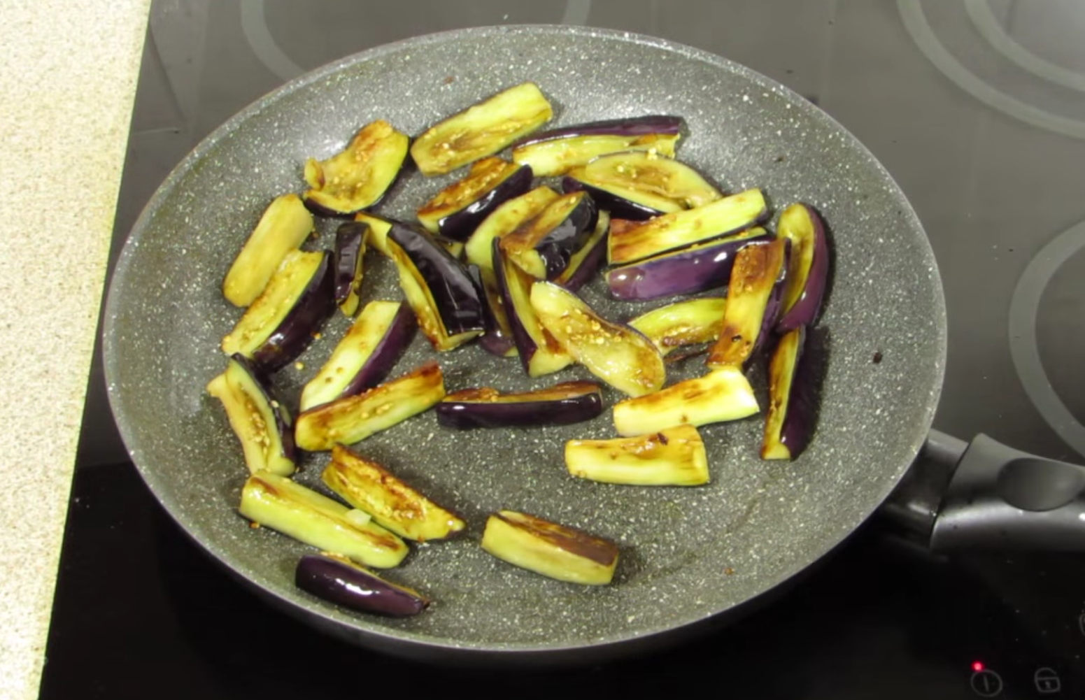 Подогреем сковородку с маслом. Обжарим баклажаны с двух сторон до золотистого цвета.