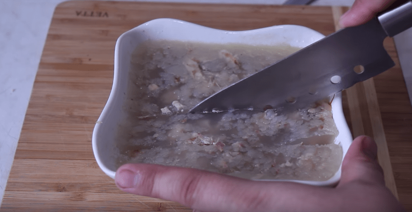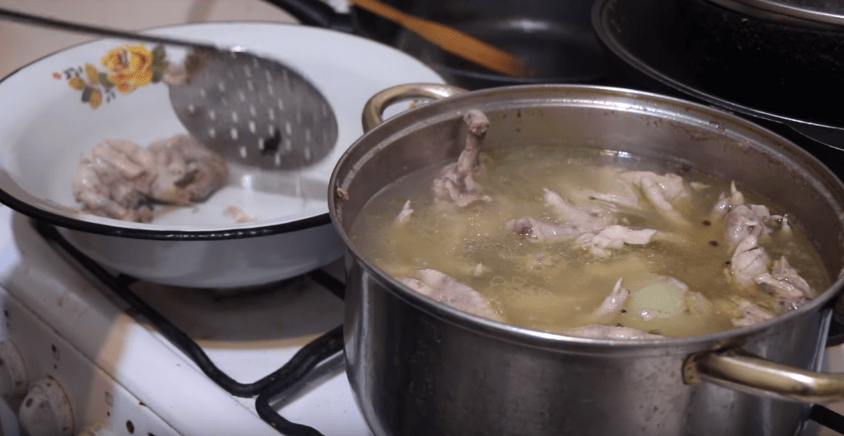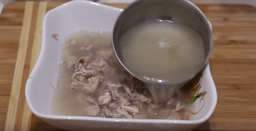 - Небольшое количество бульона, примерно полстакана отольем отдельно и остужаем до комнатного состояния.