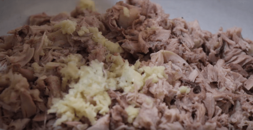 10. Остывшее куски мяса разбираю руками. Кости и всю шкурку свиную и куриную выбрасываю. А мясо расщепляю вилочкой на мелкие волокна. Чеснок мелко режу или продавливаю сквозь пресс. Смешиваю всё с чесноком и перчу молотым чёрным перцем.