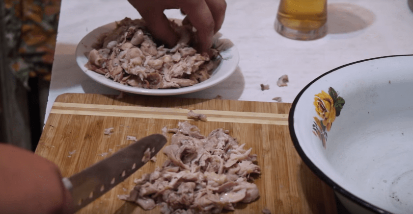 Куриное филе, которое мы привыкли использовать в приготовлении любых салатов, в этом рецепте не подойдет — оно слишком сухое. Можно использовать только окорочок, но идеальный вариант — отварить целую курицу.
