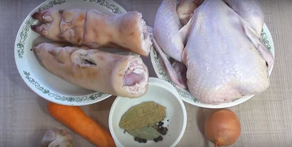 1. В супермаркете покупаем охлажденный готовый набор для куриного холодца. Берем по куску мясо двух разных птиц — курицу и индейку. Из всего этого мясного набора у нас получится наваристый, крепкий прозрачный бульон.