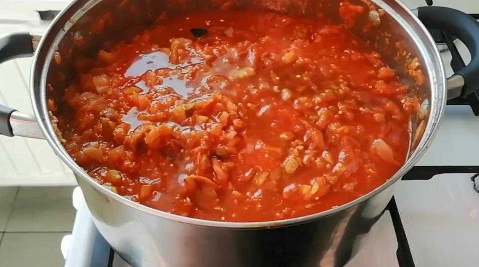 К получившейся овощной пасте необходимо добавить перечную смесь, томатную пасту, соль, специи и сахар. После это всё нужно перемешать и поставить на маленький огонь до кипения.