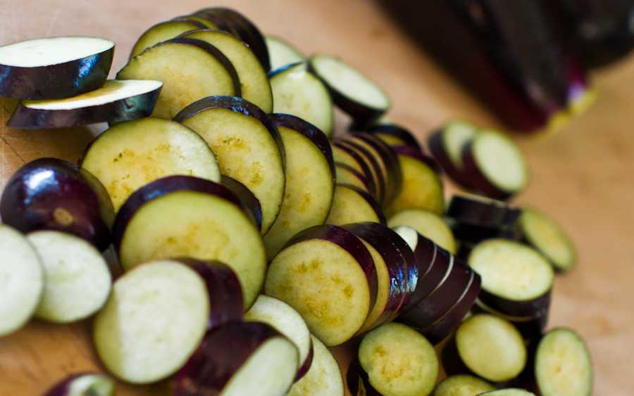 Для начала овощи моются, а затем нарезаются. Баклажаны и кабачки традиционно режут кубиками (иногда кольцами), но кожуру с синеньких лучше срезать заранее, до нарезки.