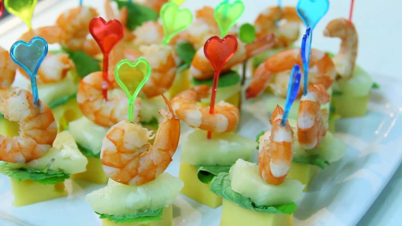 - Аппетитные канапе с креветками на шпажках готовы и вы можете украшать ими праздничный стол.