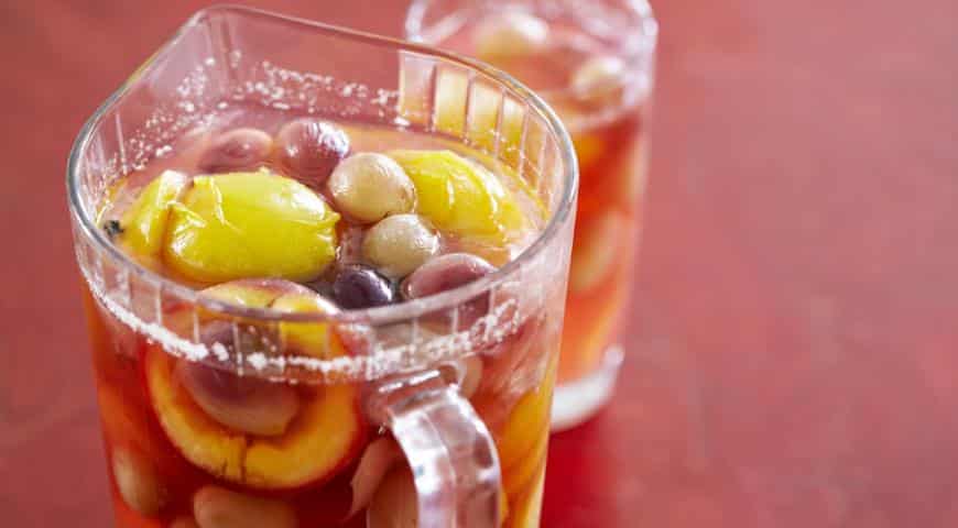 Рекомендуется закрыть на зиму вкуснейший витаминный напиток. Виноградно-нектаринный напиток имеет яркую окраску и приятный аромат. Понадобится 400 грамм нектаринов, 300 грамм винограда (лучше темные сорта), 2 литра воды, 350 грамм сахара.