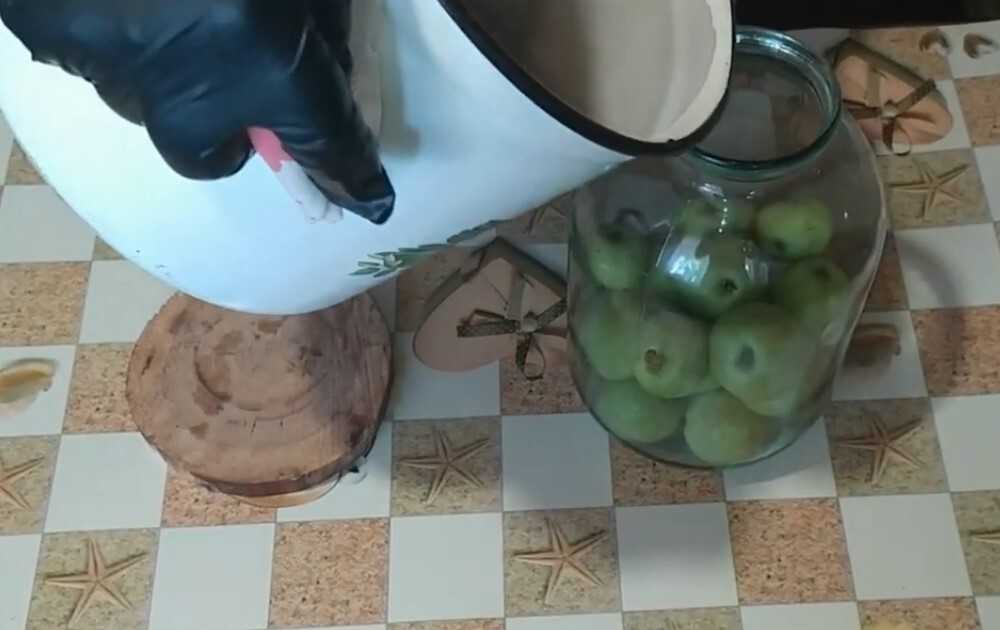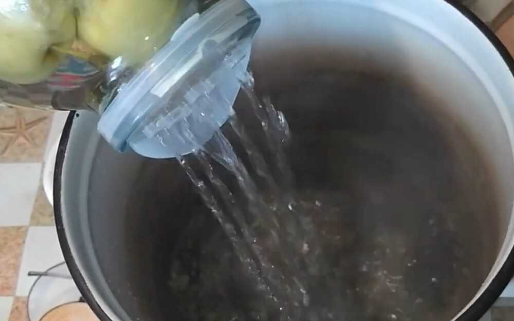 Через 20 минут одеваем на банку специальную крышку и сливаем обратно воду в кастрюлю.