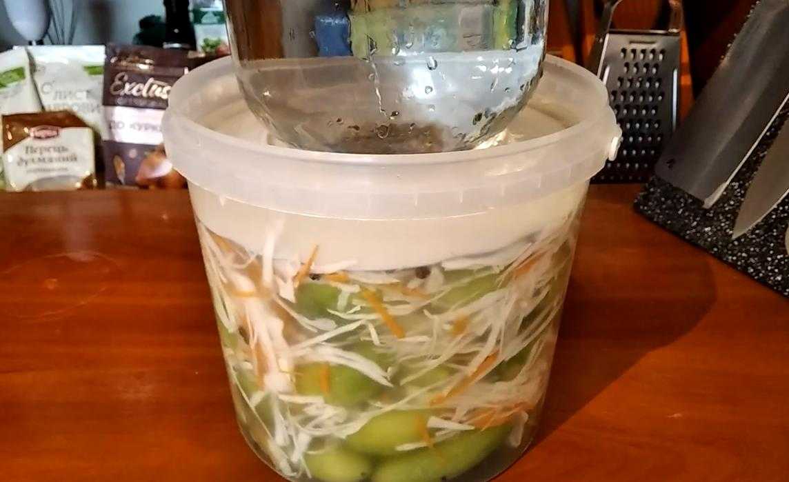 В воду добавить соль и сахарный песок, тщательно перемешать до растворения песчинок. Залить холодным рассолом овощную массу, сверху поместить подходящий деревянный круг и груз.