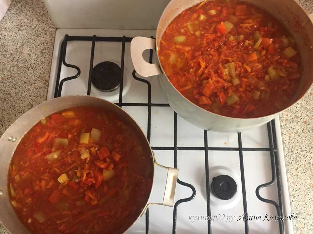 Распределяем по двум кастрюлям салат и продолжаем варить 10-15 минут после закипания. В течении этого времени не забываем помешивать. Если есть довольно большая кастрюля, то можете варить в одной ёмкости. У меня не оказалось, поэтому я разделила на две ёмкости. За две минуты до готовности добавляем уксус, перемешиваем и продолжаем варить.