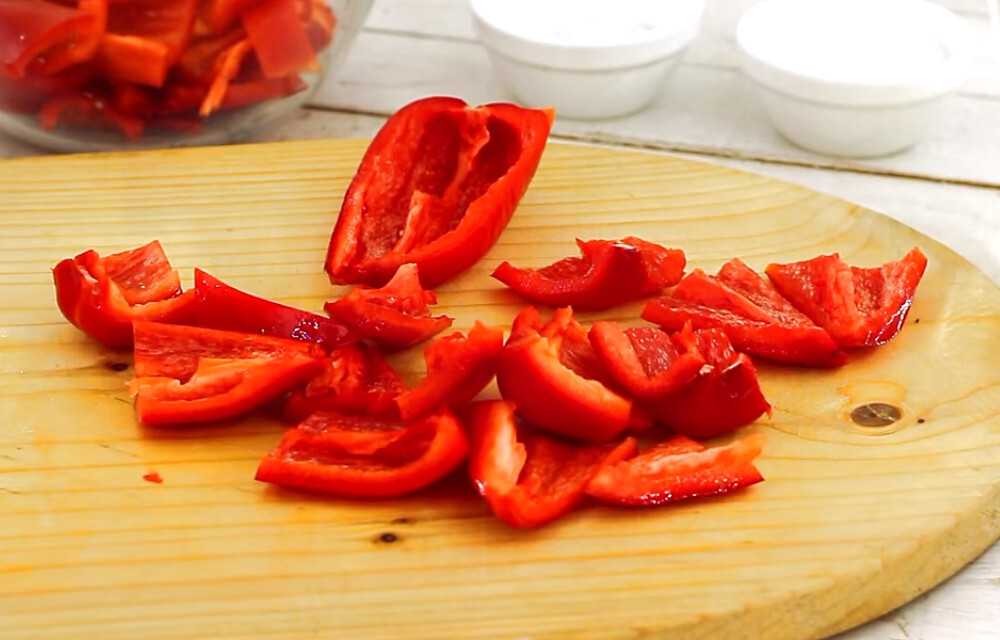 - Нарезают перцы вдоль кружочками, крупными полосками или делят четвертинками на 4-6 частей. Если планируете добавлять лечо в суп или рагу, лучше овощи резать мельче.