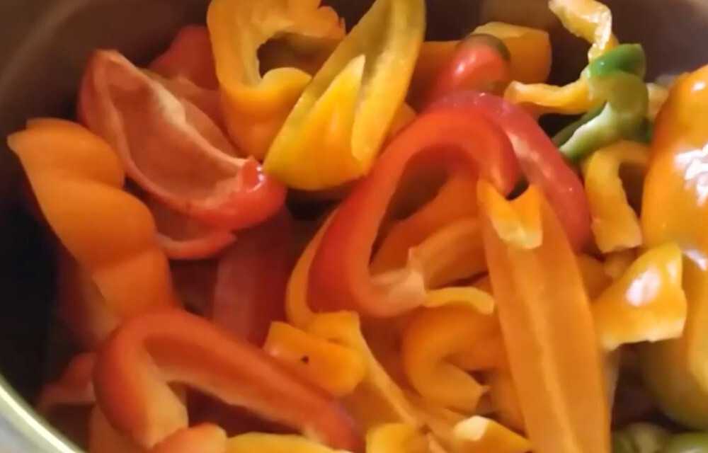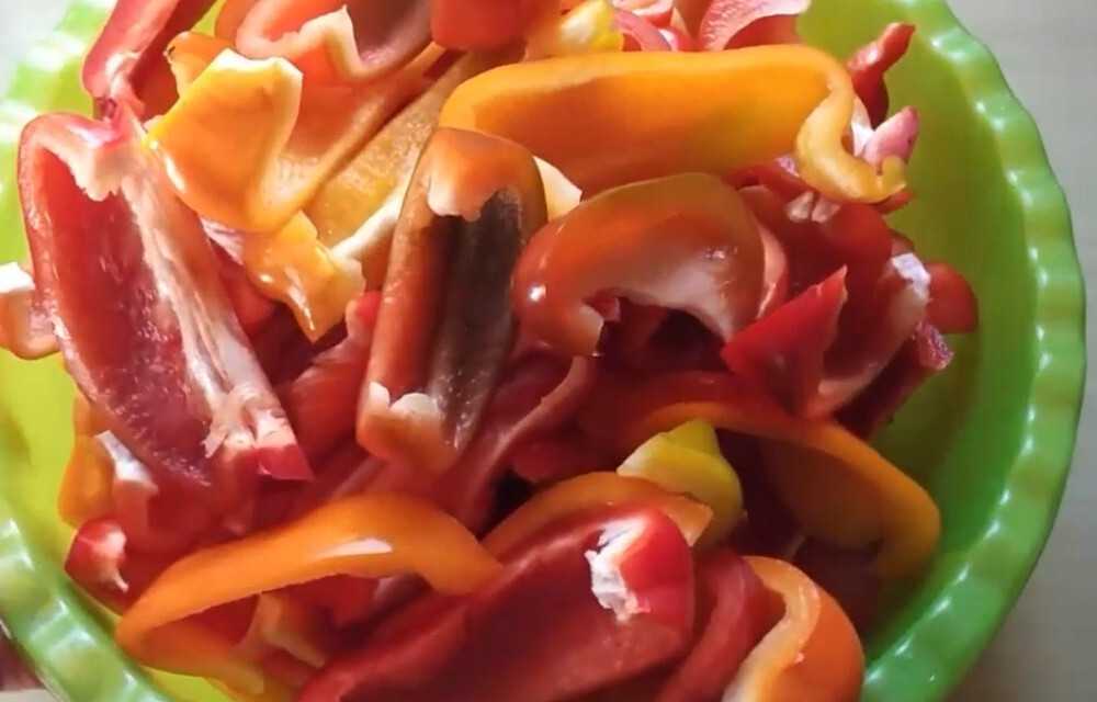 1. Этот вариант интересен тем, что предстоит сначала обжарить болгарский перчик на сковороде с растительным маслом. Для этого возьмите хорошую сковородку с толстым желательно дном, ливните масла и поставьте на плиту. Как только масло станет теплым вносите колечки болгарского перца. Прежде конечно же ополосните его и удалите семена, нарежьте оригинальным способом, можно просто на тонкие полоски.