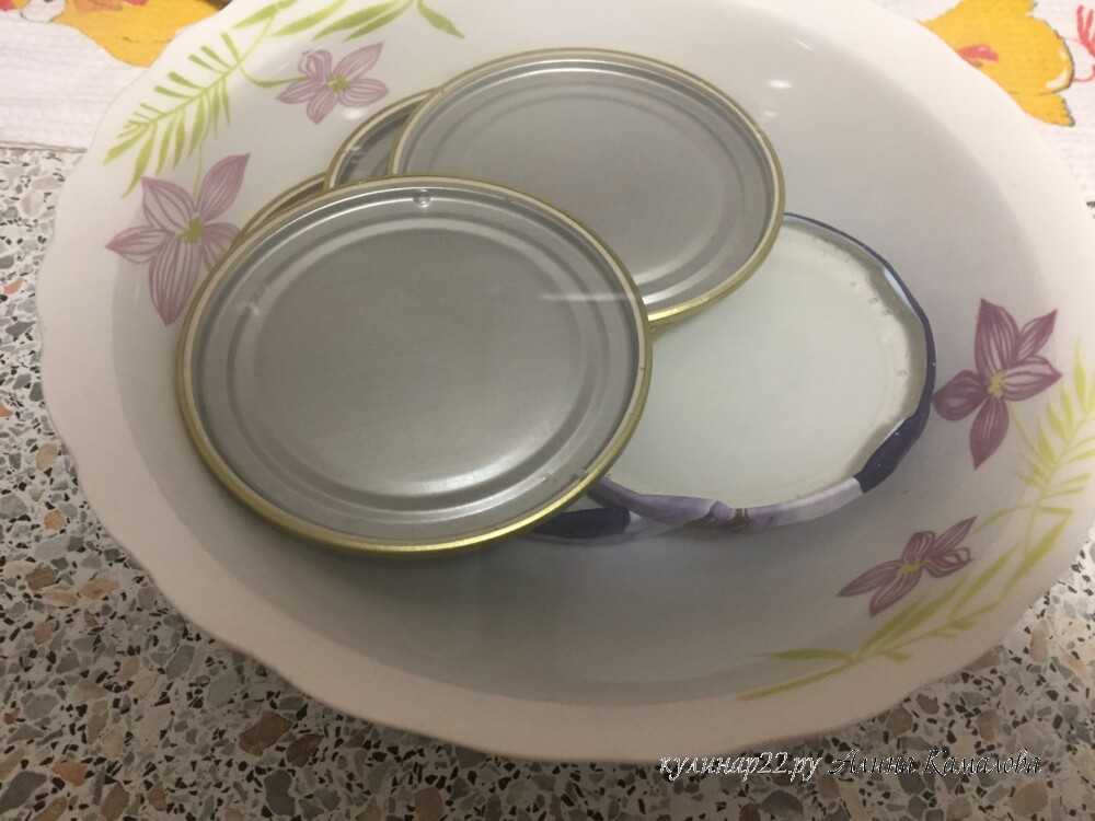 Крышки выкладываем в глубокую миску и заливаем крутым кипятком на 10 минут. После сливаем воду, а крышки выкладываем на чистый полотенец, для того чтобы были сухими. Таким образом в салате не будет лишней воды.