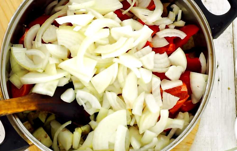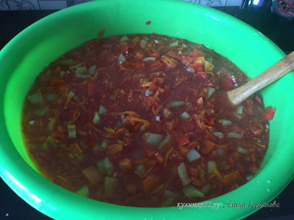 Берем деревянную ложку и все составляющие лечо хорошенько перемешиваем так чтобы все составляющие смешались между собой.