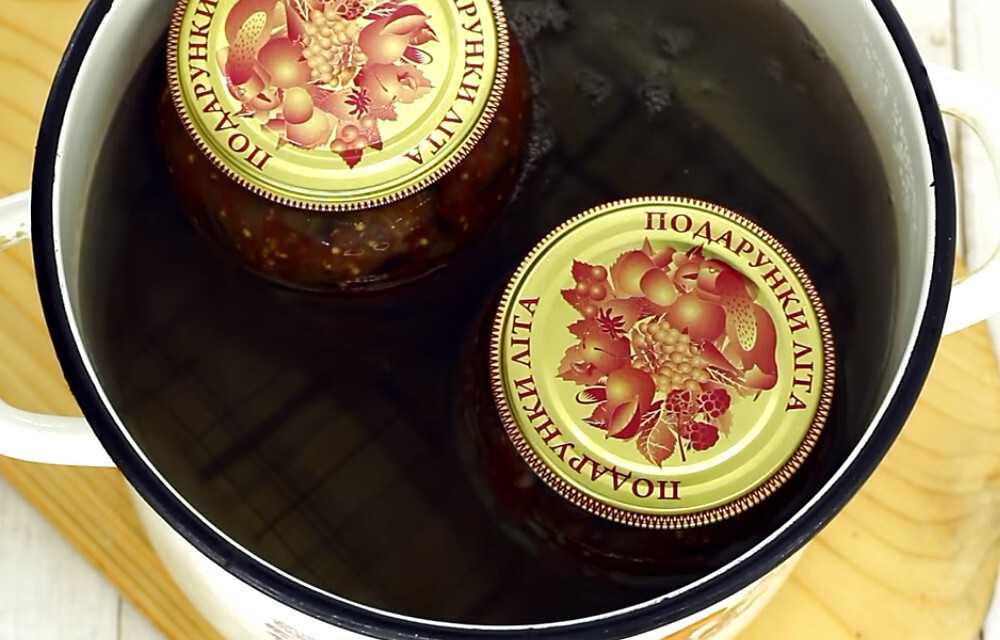 Готовую горячую массу раскладываем по подготовленным банкам и накрываем крышками. Затем берем кастрюлю, на дно ёмкости укладываем полотенец. Сверху ставим банки, заливаем водой так, чтобы при бурлении вода не попадала во внутрь тары. С момента закипания стерилизуем 20 минут.