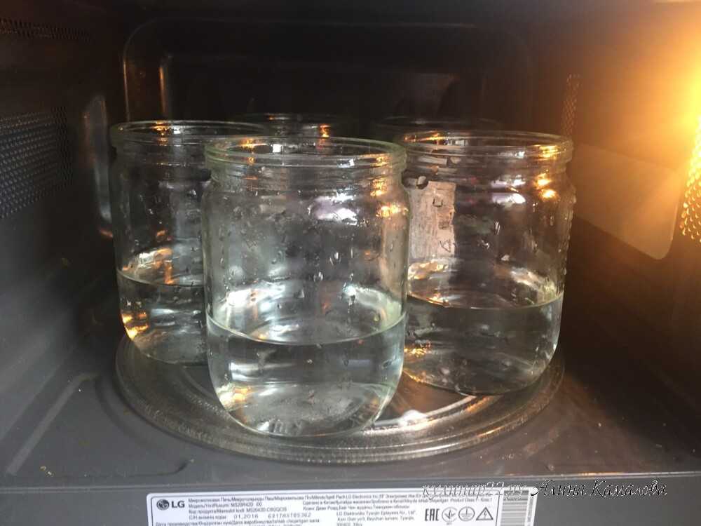 Банки хорошо промываем в воде с содой, наливаем в них чистой воды примерно на три четверти и ставим в микроволновку на 10 минут на самую большую мощность. Затем вынимаем, сливаем воду и переворачиваем на чистый полотенец, чтобы они обсохли.