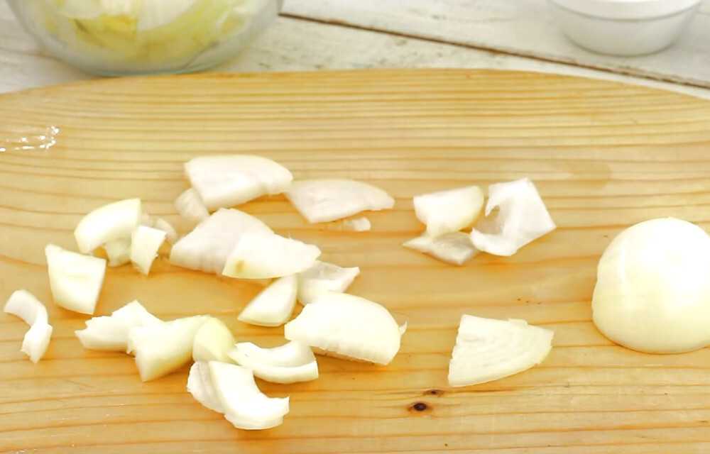 Лук очищаем, моем и режем на кубики или полукольца. А вообще нарезать можно в произвольной форме, это по вашему желанию.
