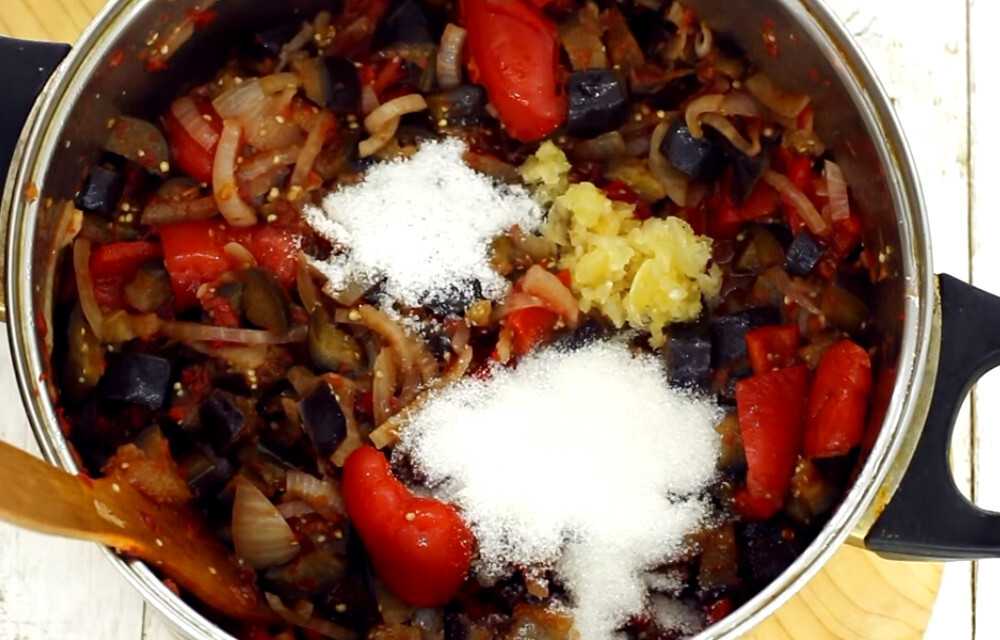Через 30 минут мы видим, что овощи дали достаточно большое количество сока. Самое время добавить измельченный чеснок, соль и сахар, перемешиваем и доводим до кипения. Провариваем 7-8 минут.