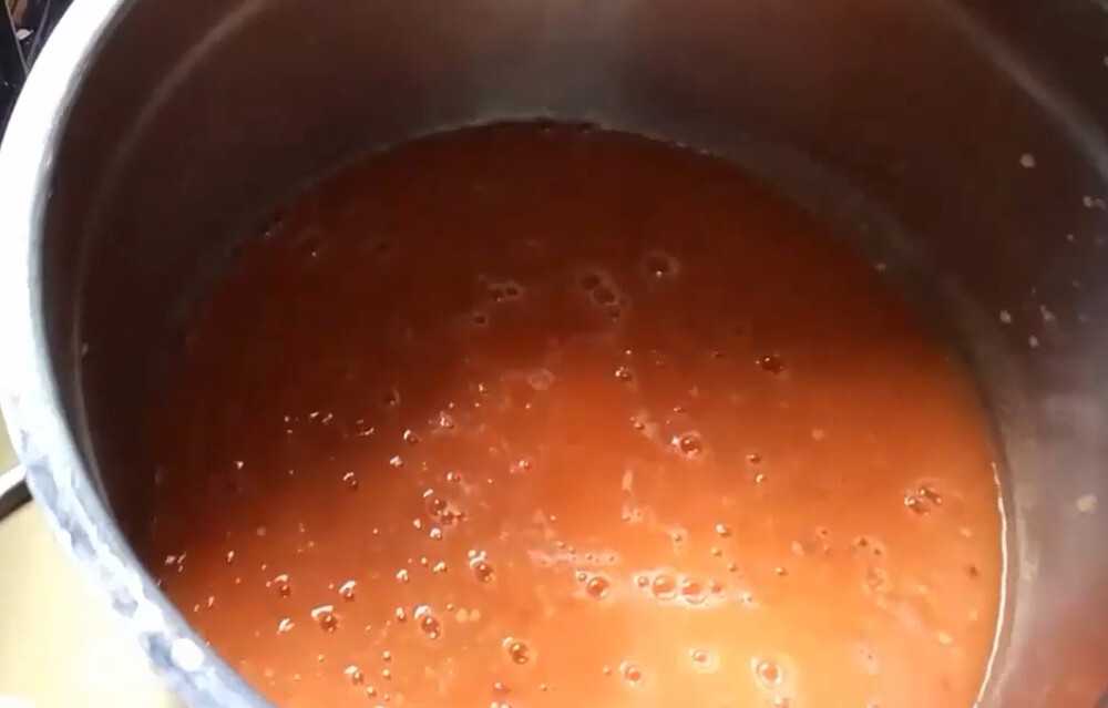 - В емкость с глубоким дном и толстыми стенками вылить, полученный томатный сок с мякотью.