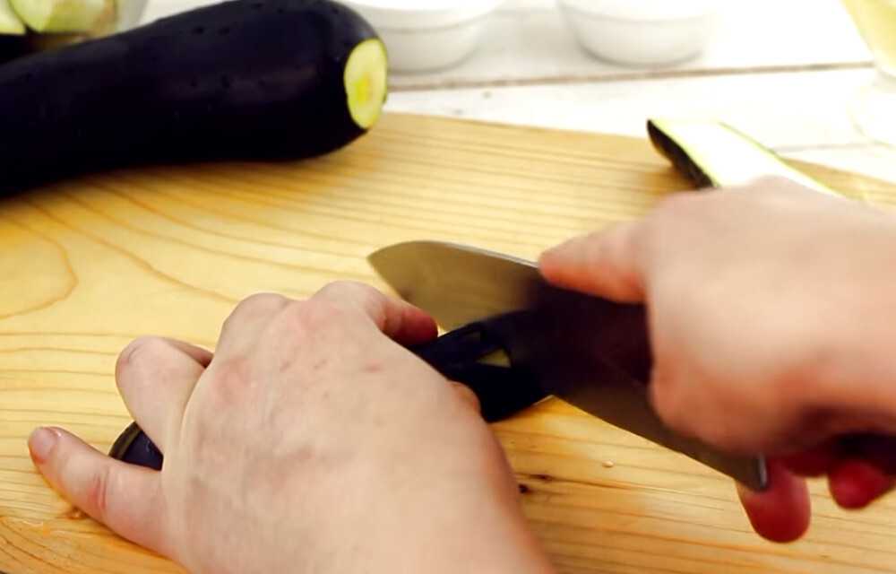 - Срежьте стебель баклажана и полностью очистите кожуру, используя нож или овощечистку. Очищенные баклажаны порежьте на маленькие кусочки. Помойте красный болгарский перец и срежьте верхушку. Разрежьте перец вдоль на две части, чтобы удалить семена и белые перегородки изнутри. Затем каждую половину перца порежьте на короткие полоски.