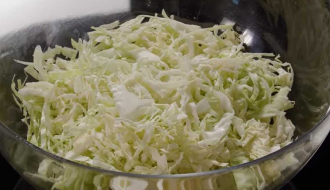 1.Мелко нашинковать капусту. Для этого лучше выбирать овощи позднего урожая, плотные и упругие.