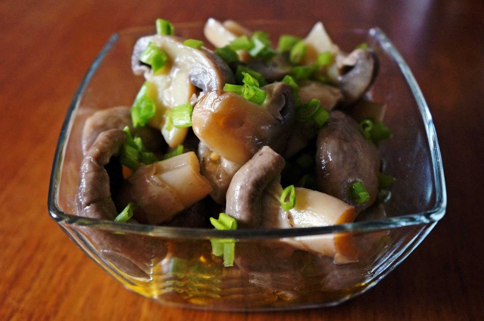 Самый простой и быстрый салат из самих же грибов — слить маринад, добавить растительное масло, лук, чеснок и каплю уксуса.