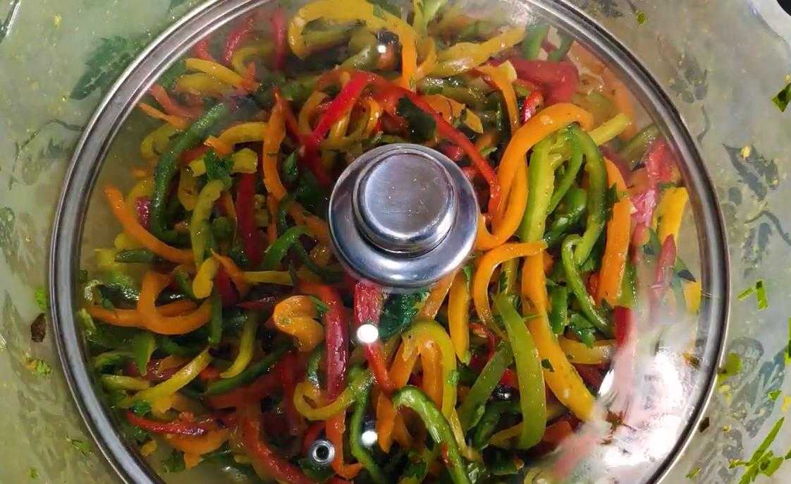 - Перцы разрезать вдоль; очистить от перегородок и семян. Перцы нарезать на кусочки, пропустить через блендер с чесноком.