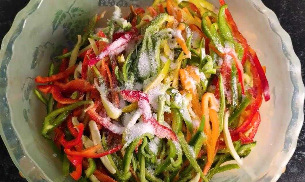 Подготовленный сладкий перец нашинковать тонкой соломкой. Посыпать солью, сахарным песком, перемешать руками, слегка приминая.